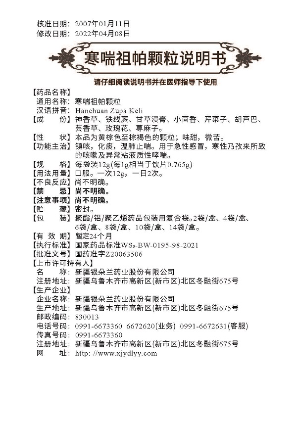 功能主治:镇咳,化痰,温肺止喘。用于急性感冒,寒性乃孜来所致的咳嗽及异常粘液质性哮喘。